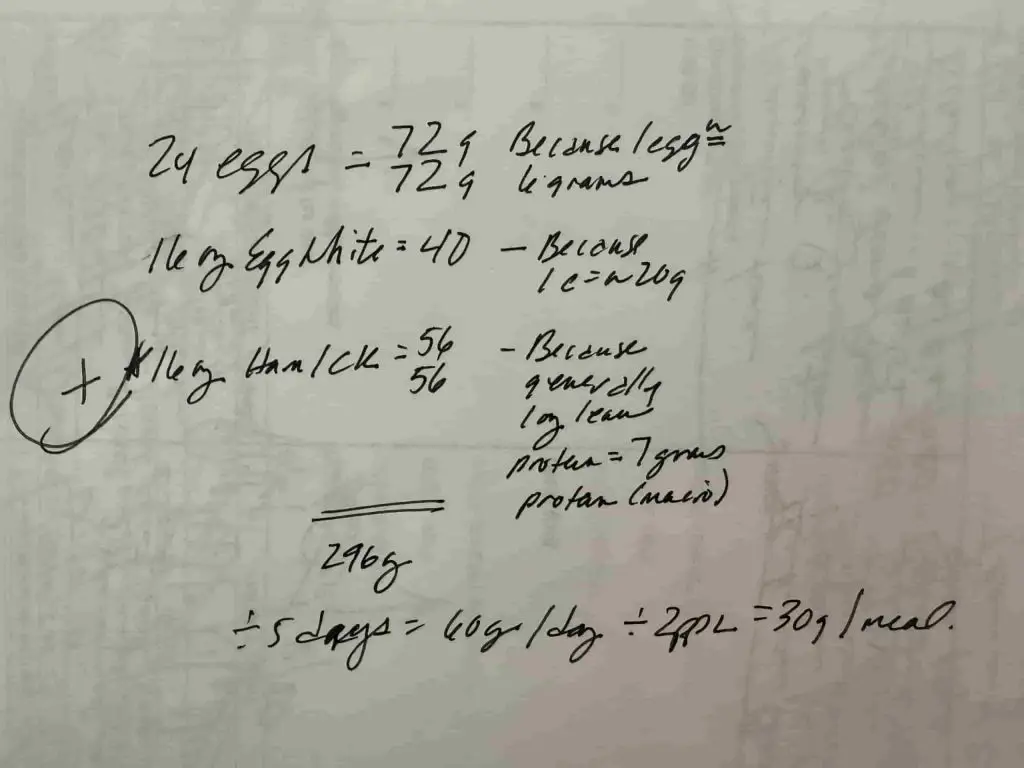 The entire skillet comes out to be about 300 grams of protein, divided by 5 days, divided by 2 people – about 30 grams a meal. This could be bulked up by a little more ham or egg whites to get us to 50 grams a meal.